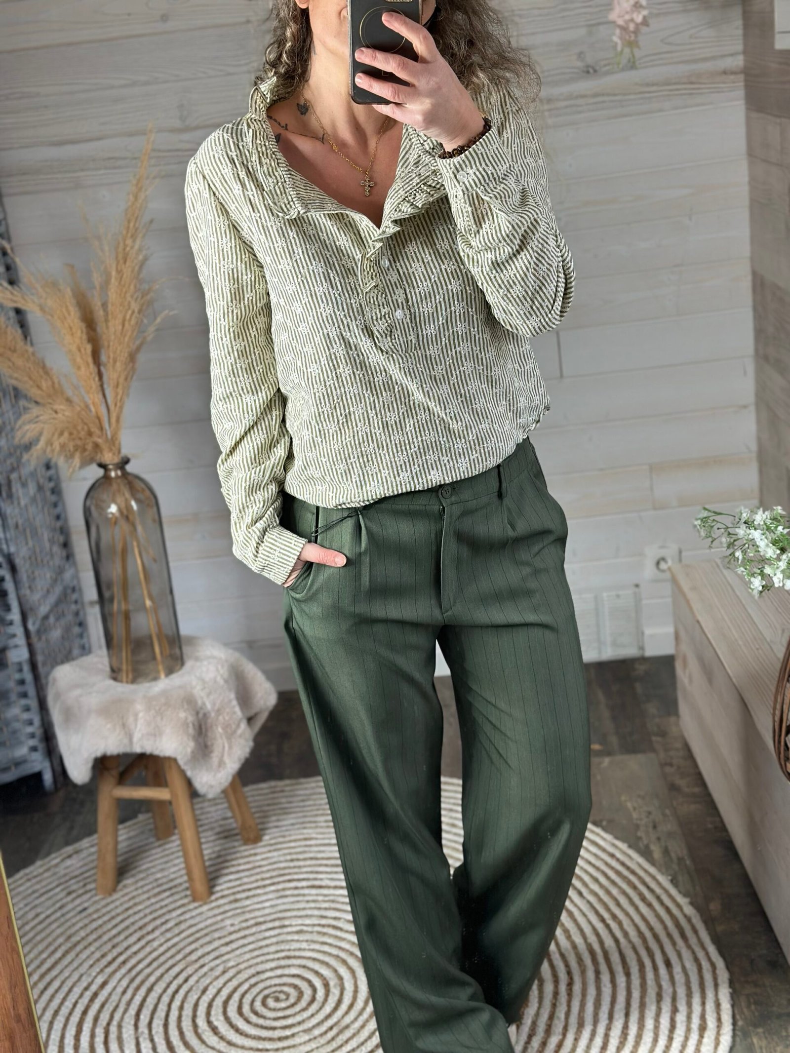 Superbe blouse brodée à rayures de chez Rue Des Abbesses 🇫🇷coloris kaki et blanc