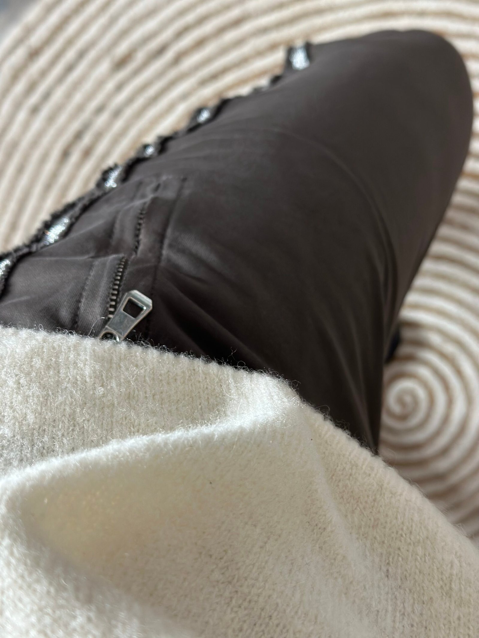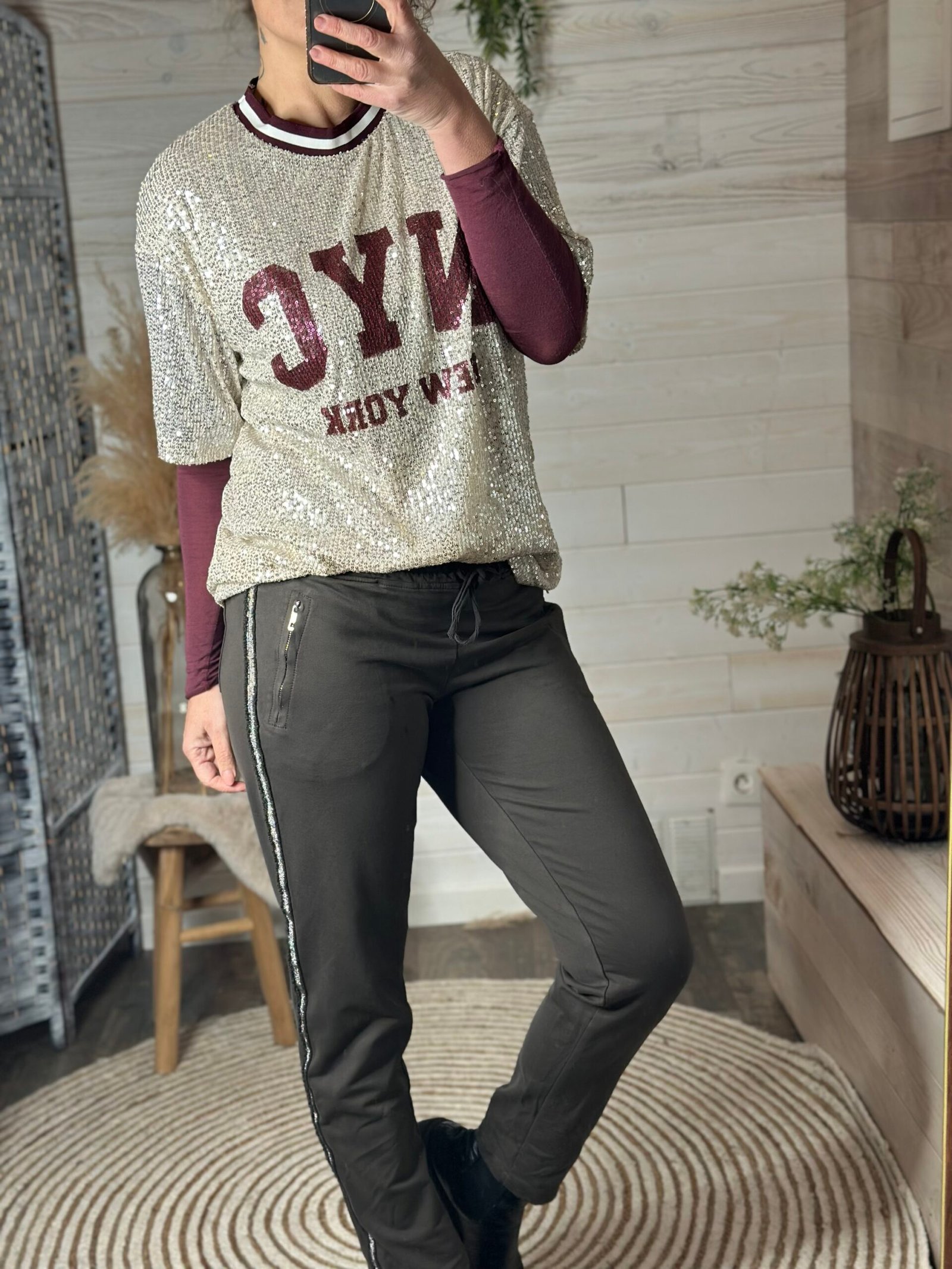 Jog taille élastique avec bande argentée sur le long de la jambe et zipp aux poches sur le devant