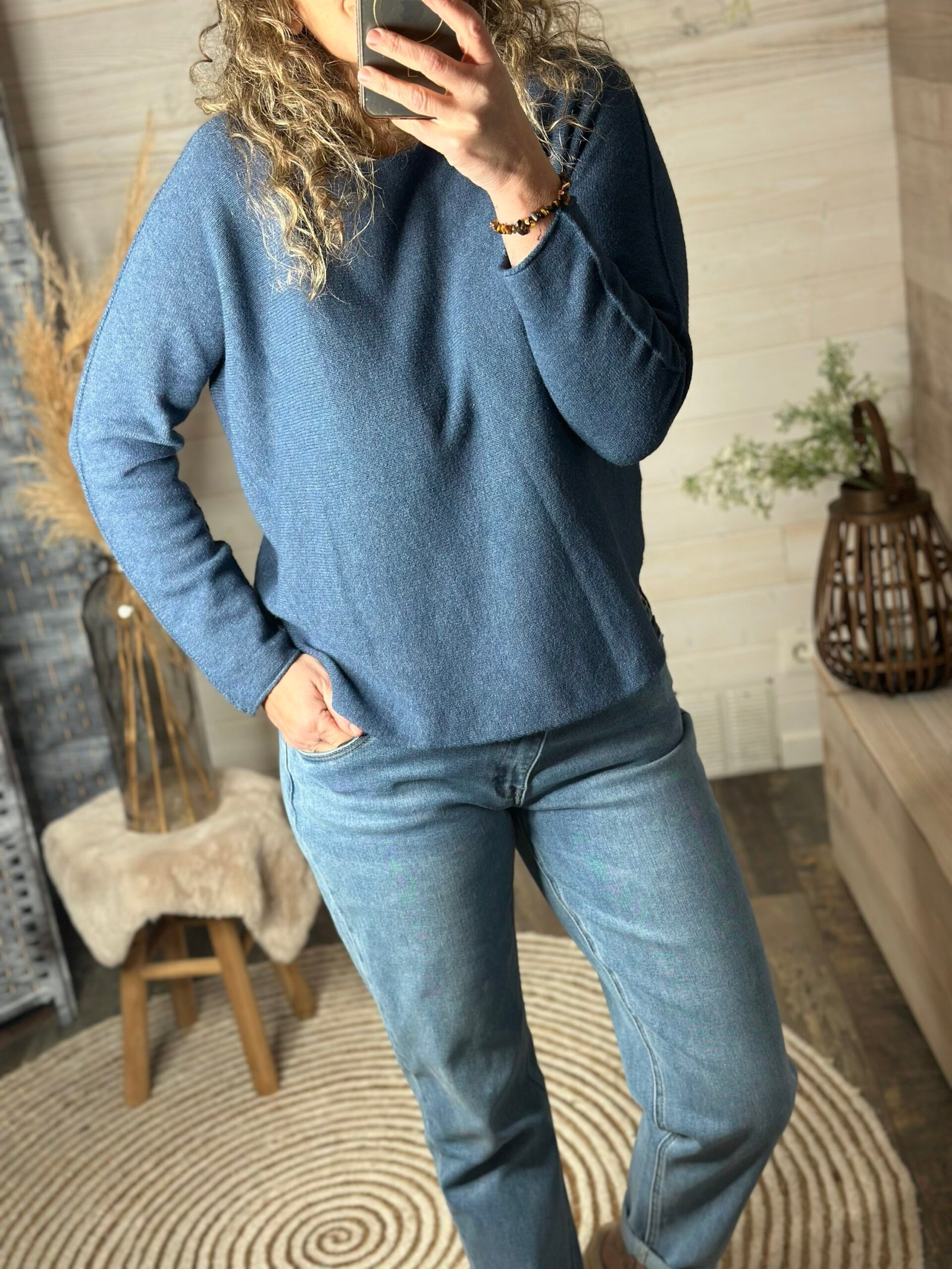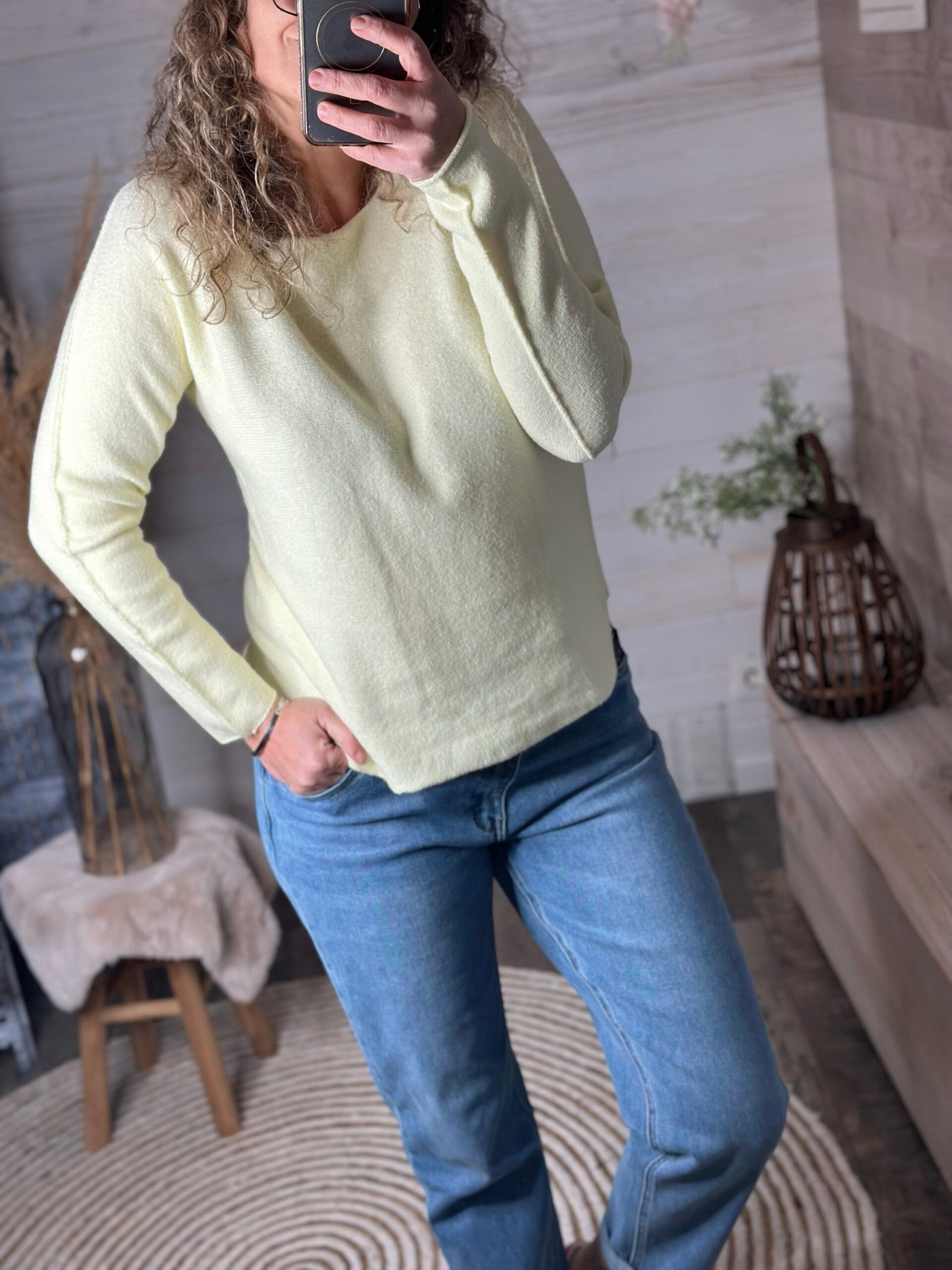 Très belle matière pour ce pull iconique à col rond 🩷💙💛finition couture sur le bras 💕