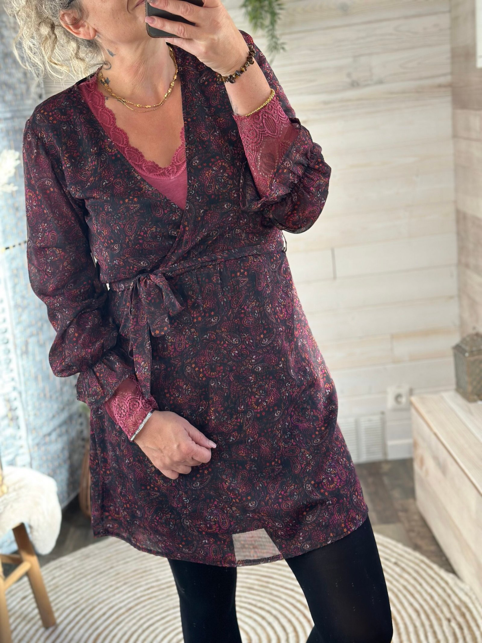 Robe en voilage avec un superbe imprimé cachemire sur les tons de bordeaux prune…